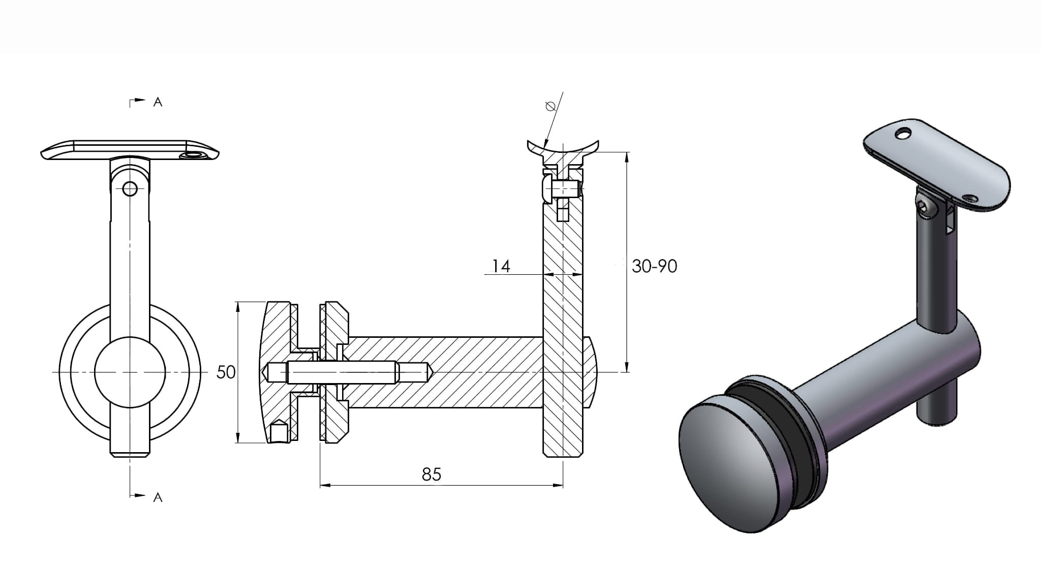 Fi xation „main courante (profil) –verre (entretoise Ø 50mm) - réglable, AISI 304, brossé