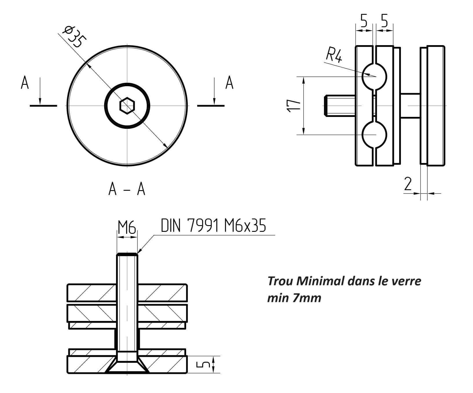 • Le trou de montage minimum dans le verre - ø 7 mm