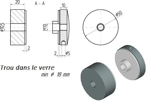 Fixation ponctuelle ø50/20mm M10, AISI 304, brossée