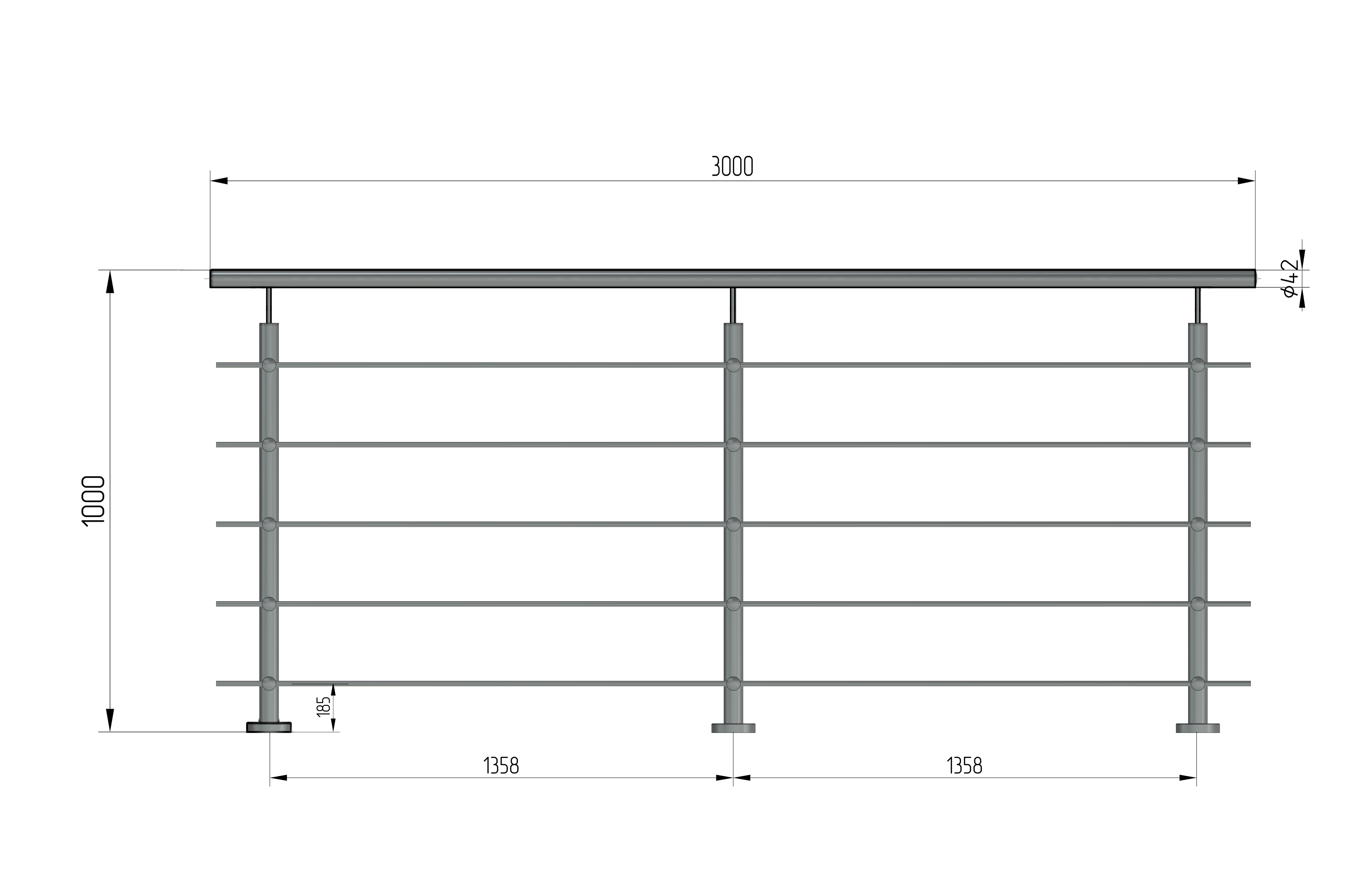 - 3 pcs – Poteau fabriqué en tube Ø42,4 mm, hauteur 960 mm + hauteur de la main courante Ø42,4 mm