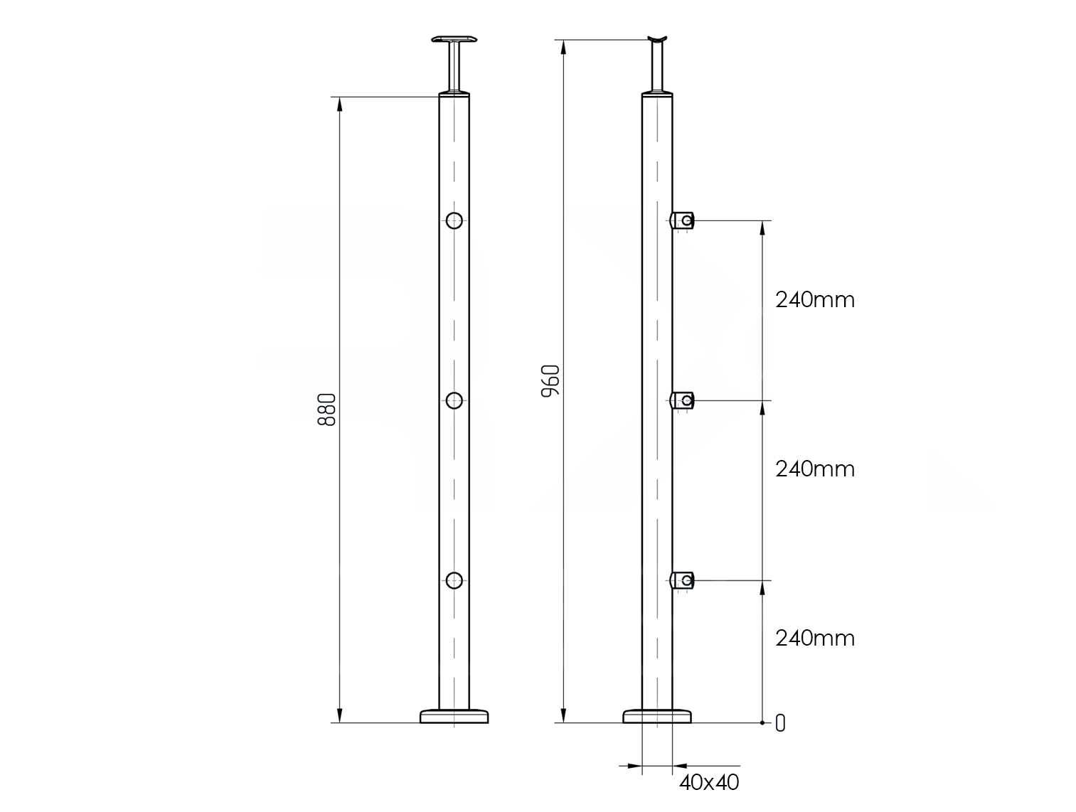 Poteau 40х40mm 960mm 3 lisses fi12mm , AISI 304, Brossé